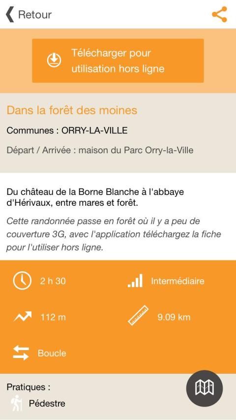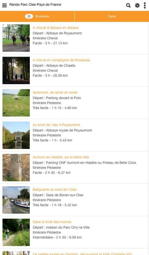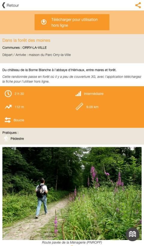 Invitation à la balade et à la randonnées, à pied, à cheval et en VTC, cette application facilite la préparation des sorties dans le Parc Oise-Pays de France : descriptifs, photos, itinéraires tracés sur carte, parkings, parcours 3D... sont téléchargeables et accessibles à tous. Les critères de choix de chaque itinéraire (type de pratique, durée, difficultés, dénivelé, ...) permettent à chacun de trouver la balade idéale.