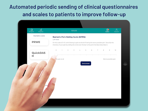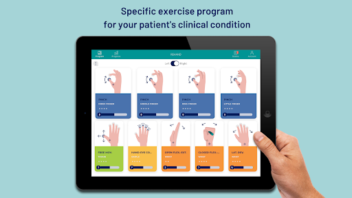 ReHand has been developed by a team of healthcare professionals including surgeons, physiotherapists, physicians and occupational therapists. The exercise programs implemented are evidence-based. All exercises are performed through touches and movements on the tablet screen and guided by feedback, allowing the retraining of the functional ability of the wrist-hand-fingers segment. Prior to each exercise an adjustment is made, ensuring that the work by the patient is always painless and in accordance with his/her limitation of movement. The exercises are adapted and progressed according to the patient's evolution, seeking the challenging and attentive character that these interventions require. The app also presents explanatory videos at the beginning of each exercise and audio instructions.