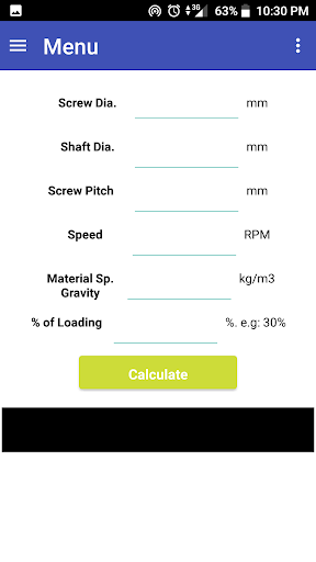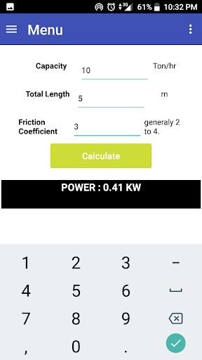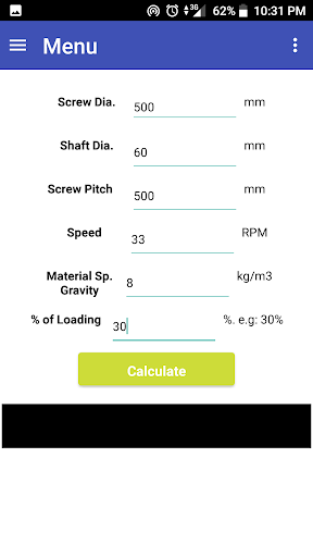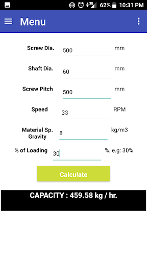 This app build to calculate Screw Conveyor Capacity, Conveyor Speed and Screw Conveyor Power Requirement.