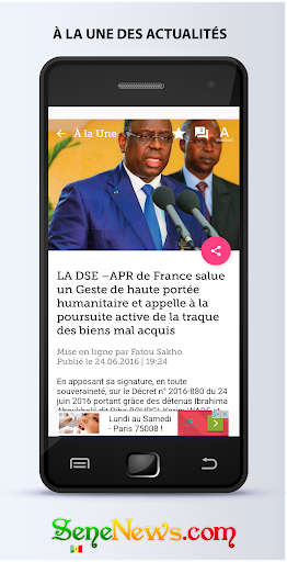 News in Senegal. The entire News Day in Senegal on your mobile . SeneNews.com is a website for general information , which deals with the Senegalese news in particular. The team is based largely in Senegal, but also in France and the United States.