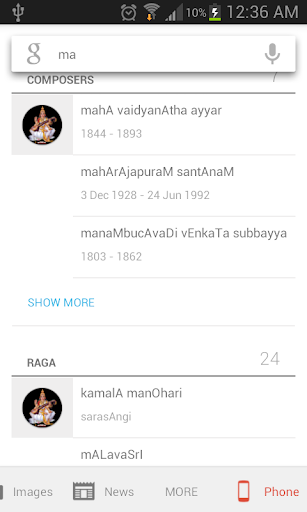 - Ragas and Composers can be searched from the global android search by enabling Shadjam in search options. E.g; Google Now, QSB.