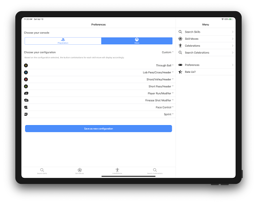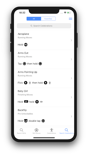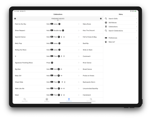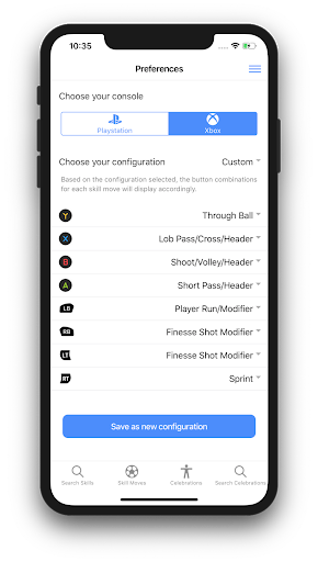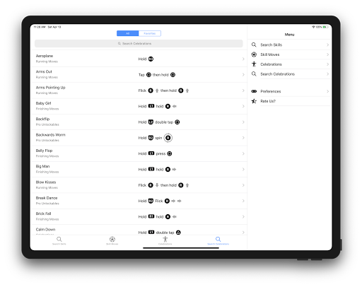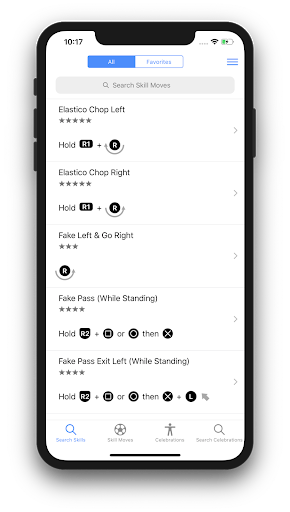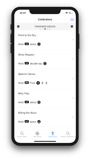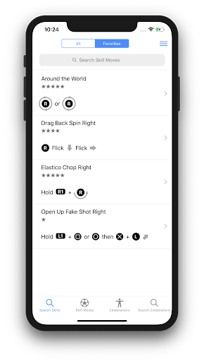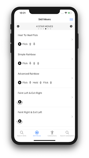 This app covers all the skill moves and the celebrations. No need to worry even if you use a custom controller settings. This app allows you to configure your controller setting and then view the skill moves and the celebration with respect to your own settings. This makes it very easy to practice any skill moves or perform any celebrations of your choice. By default, it comes with the standard "Classic" and "Alternate" controller configuration. The app allows adding more configurations. In addition to this, you can create your own list of favorite skills and the celebrations.