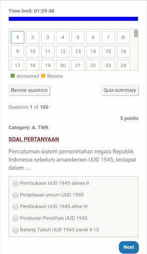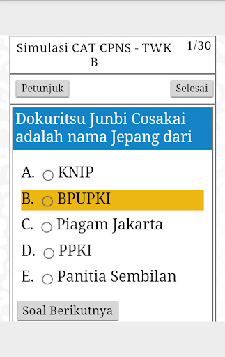 Untuk latihan, dalam aplikasi ini, kami mendesain kamu tidak bisa mengganti jawaban, dan tidak bisa kembali ke soal yang tidak kamu jawab. Di akhir, setelah kamu selesai menjawab semua soal, kamu dapat melihat skor yang kamu peroleh; lalu kamu dapat melihat jawaban yang bernar dan salah pada tab "Review Simulasi" di kanan atas. (untuk TWK dan TIU).
