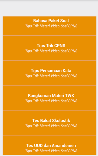 Di dalam aplikasi ini, kalian dapat mengetahui kisi-kisi materi dan contoh soal yang sering keluar dalam Ujian CAT Seleksi Kompetensi Dasar CPNS; yang kami kumpulkan dari berbagai sumber.
