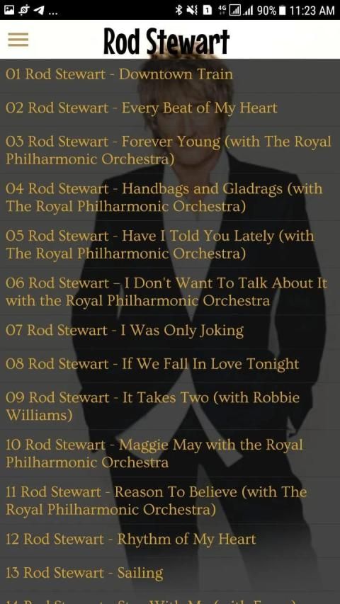 Rod Stewart musisi berkebangsaan Inggris yang aktif sejak tahun 60an hingga sekarang Rod Stewart menjadi salah satu musisi dengan penjualan album rekaman terbaik dengan penjualan mencapai lebih dari 120 juta kopi di dunia dengan 4 single nya pernah menduduki no. 1 di tangga musik Billboard, dengan lagu hitsnya seperti "I Don't Wanna to Talk About It", "Have You Ever Seen The Rain", "Forever Young", dan " Maggie May" yang dapat anda dengarkan lagu-lagu dari Rod Stewart dengan aplikasi ini.