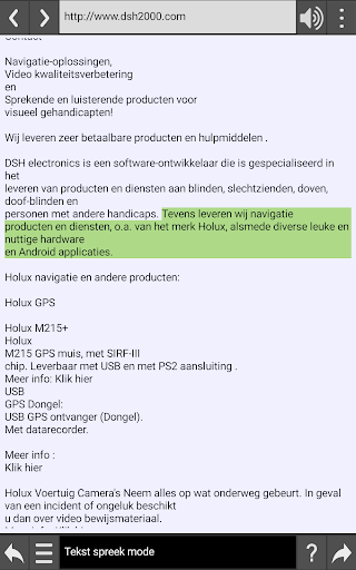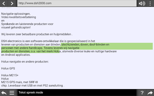This Android application can read the contents of almost any web page aloud. This can be useful in low-light environments where the web page is not easily readable, or when you are busy with other things and in the meantime want to hear what information is on a particular website. For example ideal to read things like, the weather forecast, traffic information or a newspaper article aloud. Visually impaired people will also benefit from this functionality.
