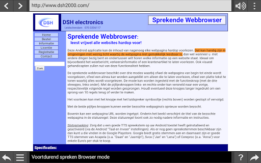 The Speaking web browser has three modes whereby either the webpage is read from start to finish, or a paragraph can be clicked to have it read separately, or show a plain text where everything is read aloud. The mode can be set with the function button (with the three dashes, bottom left). You can use the arrow buttons on the bottom left and bottom right to jump to the previous or next line more quickly. If necessary, keep these buttons pressed longer to make a jump of 10 lines back or forth.