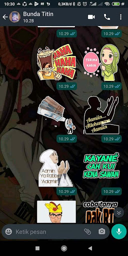Stiker wa ambyar, arep guyu kok wedi lemu, berisik lu, wayahe, mari kita jaga nkri, aku ra popo, selamat pagi, lemburan cair, mijit yang semangat kaka, insentif rapelan, muke gile, gombal, sepi, lemes, bete, tahu, keren, nyimak, terserah lodeh, se7, paan ci, pinter, biar semua tahu, gak nangka, peluk, cuka cuka lodeh, nyimak wawon, terima kasih sudah diberitahu, gak gelas, mendoan anget, siyap, mencoba meresapi, gak nyangka, nyi-max, anti dia obat supaya cepet move on, iya aku tahu, sikat miring, panutan, aneh tapi nyate, nasib anak kost, gue yang nembak dia yang dapat, arab maklum, aku deg degan, pekok pekok, aku tahu tapi diam aja, kacao, minum dulu nak, luar biawak, dll