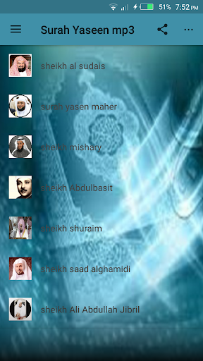 This a application contain the recitation of surah yaseen by seven world famous quran reciters in the world, those sheikhs are: