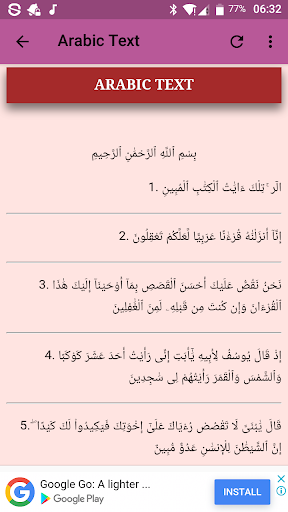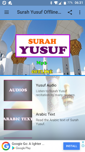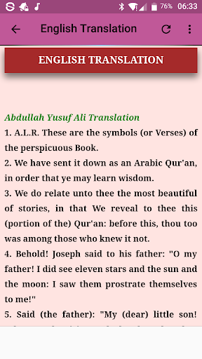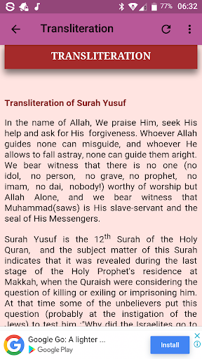 This application contains arabic text of the surah, transliteration of the surah for easy understanding, english traslation as well as lessons and benefits from the surah.