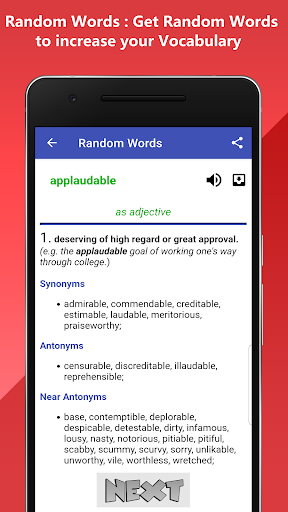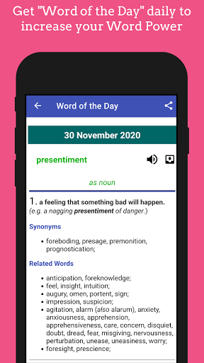 The app shows Word Definitions, Related Words, Near by Synonyms and antonyms.