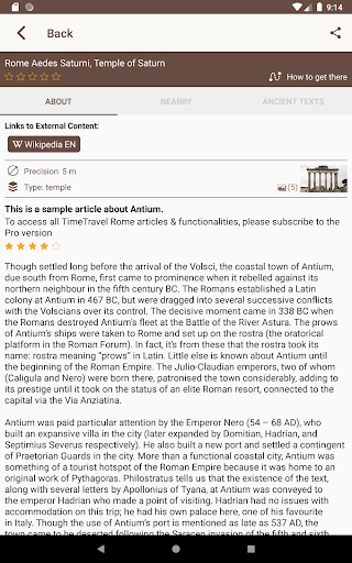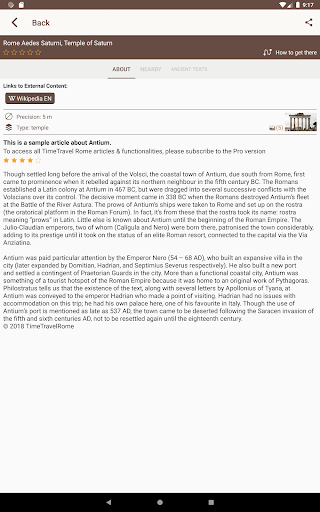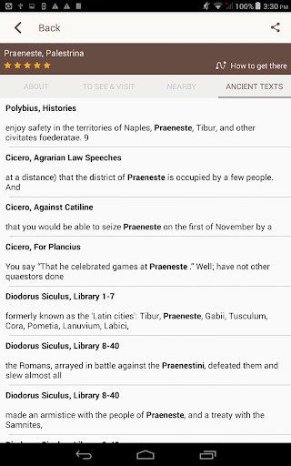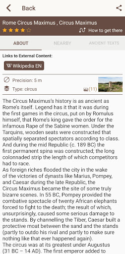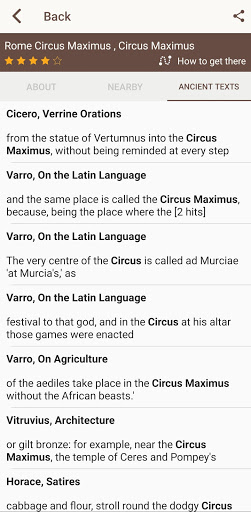 History information about Rome and other sites is complemented by ancient texts written by Cicero, Augustus, Julius Cesar, Virgil, Horace, Appian, Pliny, Plutarch, Tacitus and many other famous classic authors, making the app suitable for use by Classics teachers and students.