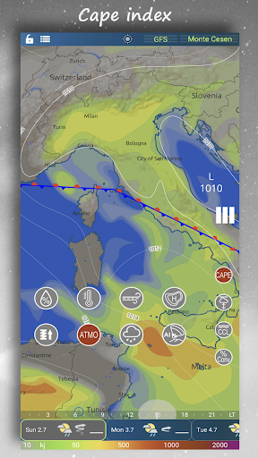 You can display clouds on maps separately or combine them for each floor. The Cape index allows you to make the most of the day while avoiding storms.