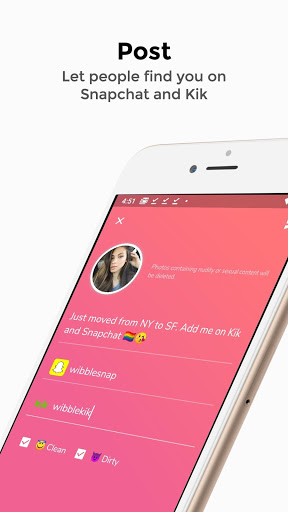 Wibble helps people to find friends and followers on Snapchat, Kik and Instagram. We provide safe and friendly environment for people to exchange Snapchat, Kik and Instagram usernames.