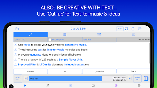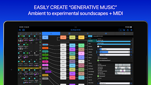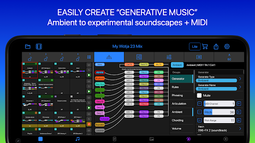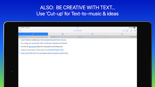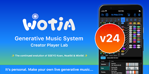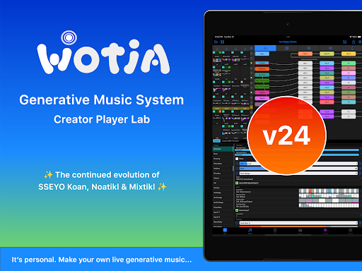 Use Wotja to generate ambient soundscapes, relaxing drones, text-to-music arps, MIDI much more. It's a FREE & powerful 'Creator Player System' for live generative music. Go Pro to do the Max!