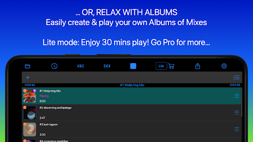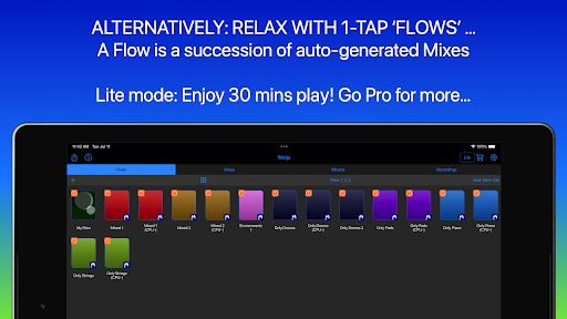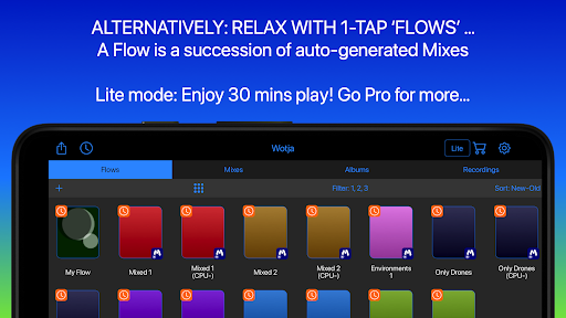 Love to chill out to relaxing generative music? Play a 1-tap 'Flow' or auto-create & play an Album. Enjoy 30 mins play for FREE! No internet connection needed.
