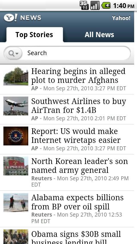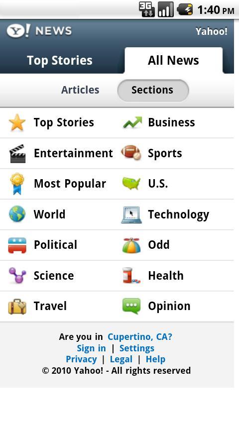 yahoo News provides updates on current events and top stories including world, national, business, entertainment sports weather, technology, and weird news. Get the latest stories from around the world, as they happen. With Yahoo! News, see top headlines, stories, and hot topics, with an easy click through to the details. search for the stories or topics that interest you. The Yahoo! News application allows you to enjoy all your favorite sections: - Yahoo! Top Stories - Yahoo! US News - Yahoo! World News - Yahoo! Technology - Yahoo! Sports - Yahoo! Entertainment - Yahoo! Health