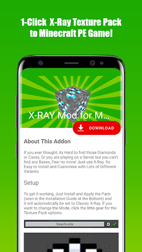 X-Ray Mod for Minecraft PE is an application that allowed you to download & install a fully functional X-Ray Addon to your Minecraft World in just 1 single tap!