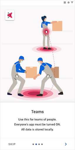 Use this app for teams at home or at work. Everyone’s device must have the app downloaded and app must turned on for detection to work. Detection will run unless paused. While paused, the app will not detect other devices or be able to be detected. You can create “Teams” of safe people and mute alerts from them, if you need to stay close but want notifications from non team members.