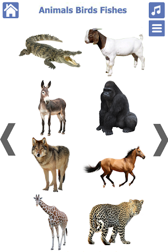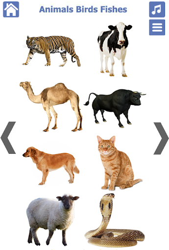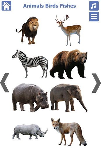 🌟 The application displays the following animals: lion , zebra, hippo, rhinoceros, deer, bear, elephant, fox, tiger, camel, dog, sheep, cow, ox, cat, snake, crocodile, donkey, wolf, giraffe, gorilla, horse, leopard, panda, pig, rabbit, turtle, kangaroo, hyena, Frog, Bat, Cheetah, Squirrel, Lizard, Otter, Raccoon, Koala, Chimpanzee, Monkey, Reindeer, Hedgehog, Weasels, Sloths, Sea lion, Walrus.