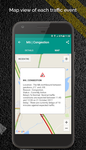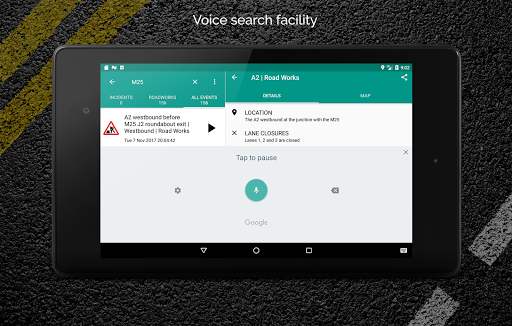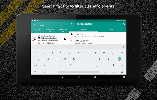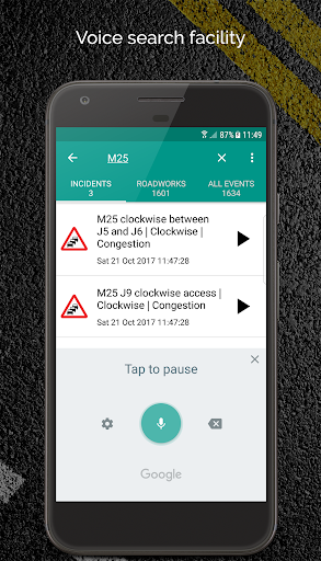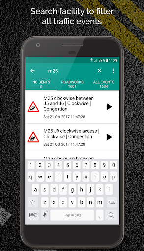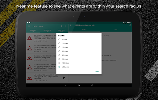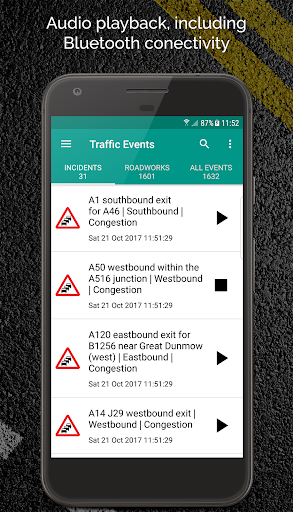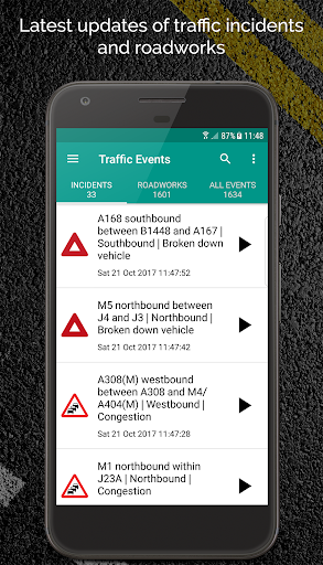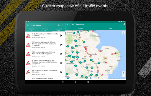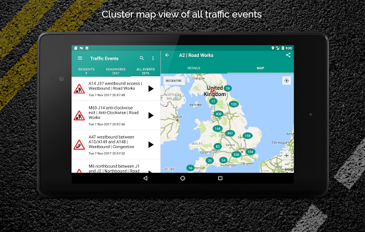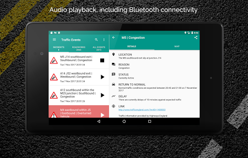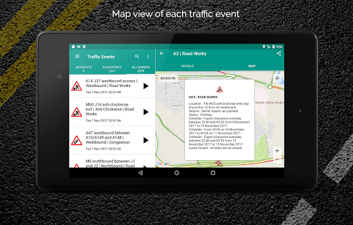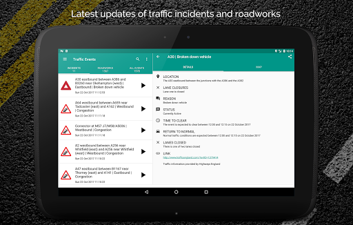 app displays the latest road traffic incidents and roadwork updates across England. Easily review updates to disruptive traffic incidents as they happen and monitor roadworks using a simple and easy to use interface, allowing you to pinpoint incidents on a map and even share this traffic information with others. This is a must-have app for anyone who travels and is perfect for reviewing routes prior to travelling to your destination, or whilst enroute at a safe interval.