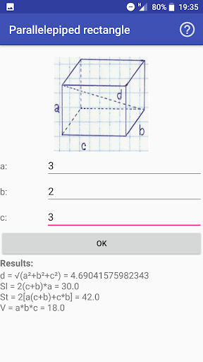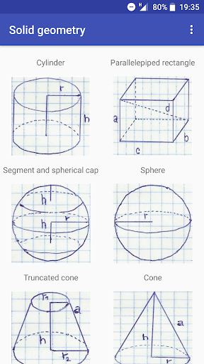 Solid Geometry is a very beautiful tool that lets you to calculate volume, lateral surface, total surface and diagonal of these solids: