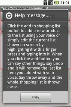 Simply click the add button again and say "undo" and the last entry you spoke will be removed. Say "throw away" and the whole shopping list will be thrown away so you can start it again. Say "help me" and a help message will be shown on screen.