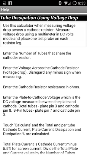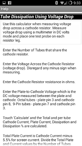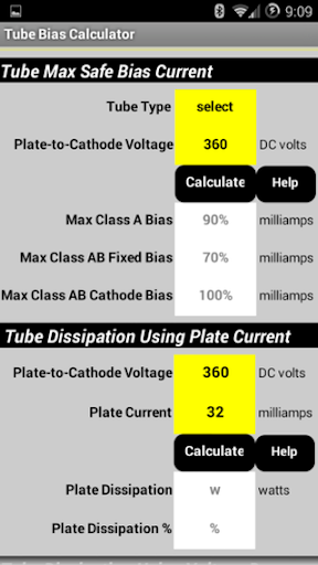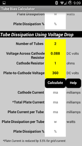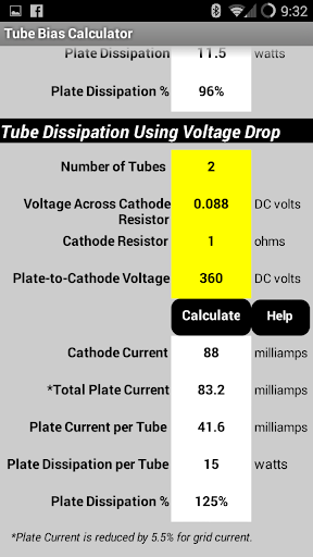 To calculate bias when you measure the plate current, such as when using the output transformer shunt current measurement, enter your Tube Type and Plate-to-Cathode voltage at the top of the page, enter the Plate Current and touch 'Calculate' and the Plate Dissipation and Dissipation% are shown.