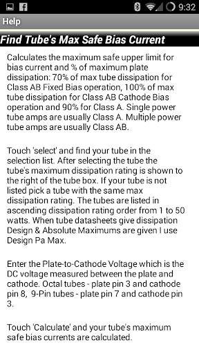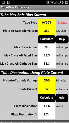 The Tube Bias Calculator will calculate power tube bias values of Plate Current, Dissipation and % of Max Dissipation using either measured voltage drop across a cathode resistor or measured plate current. It has a database of 36 tube types and will calculate the Class A Fixed,