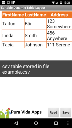 Using this demo, you can load your example csv table from the root directory of your sd card. The name of the file must be example.csv. The csv table can have any number of columns or rows. You can edit some cells and store it back to your sd card. In case no file is found, the default example table will be used.