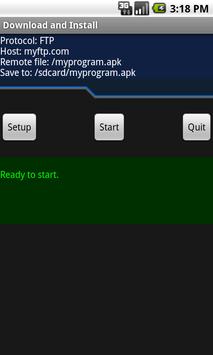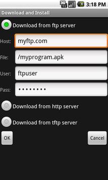 Download and install a program. DLAIN can download files from the internet or your lan via FTP. Its useful for developers to quickly transfer their applications on real devices. Store the APK file on a FTP server and DLAIN downloads and starts the installation of your program.