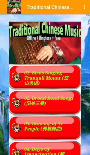 collection of Traditional Chinese Music. High quality offline audio with Ringtone, Repeat All, Shuffle, and Next. Version 2.1.