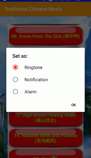 Enjoy the best collection of Traditional Chinese Music in quality offline audio with Ringtone feature. Traditional music in China is played on solo instruments or in small ensembles of plucked and bowed stringed instruments, flutes, and various cymbals, gongs, and drums. Install and enjoy the best of traditional China ambiance from Chinese classic music such as Birds Singing Tranquil Mount (空山鸟语), High Mount Flowing Water (高山流水), Rain Drops Falling on BaJiao (雨打巴蕉), Waves Washing Sands (大浪淘沙), etc.