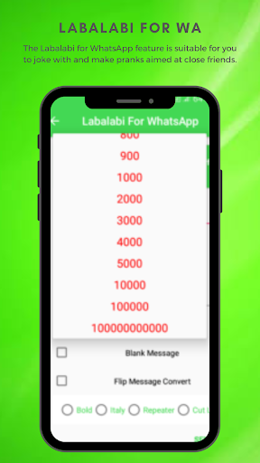 • Labalabi for whatsapp Only type one text and repeat it as often as you want with this unique text spammer