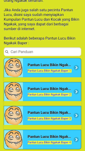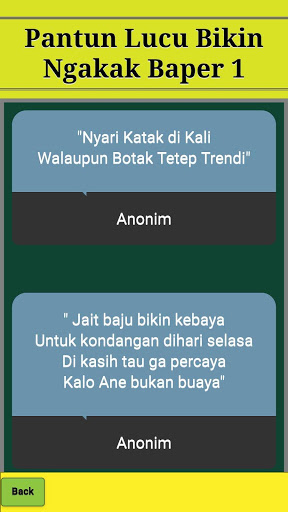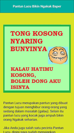 Pantun Lucu Bikin Ngakak Baper Terbaru adalah sebuah aplikasi yang didalamnya terdapat kumpulan pantun lucu atau yang biasa disebut dengan pantun jenaka. Pantun jenis ini sangat banyak disukai oleh kalangan muda dan anak anak karena pantun lucu ini dapat membuat seseorang tertawa terpingkal dan terbahak bahak setelah membacanya.