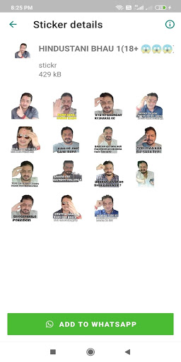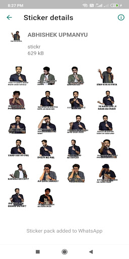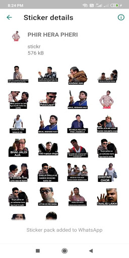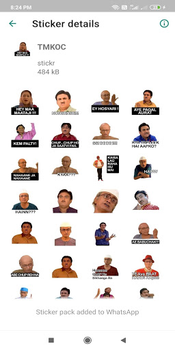 STICKR has 400 Hindi & English stickers divided into 20 Categories. These include the popular YouTubers, Stand-up Comedians, Hindi cult movies as well as the trending memes: General memes, Mirzapur, Mirzapur 2, Munna bhaiya, Jethalal , bollywood stickers, Akshay Kumar stickers, Taarak Mehta stickers, Carry Minati, Hindustani Bhau, Zakir Khan, Gangs of Wasseypur, Akash Mehta (Kuch Bhi Mehta), Abhisekh Upmanyu, Anubhav Singh Bassi, Biswa Kalyan Rath, Hera Pheri, Phir Hera Pheri, TMKOC, CID, June 2020's latest, Marathi memes. All the stickers are hand curated by some of the best professionals.