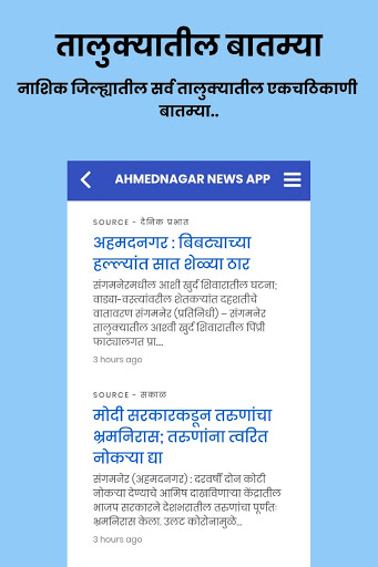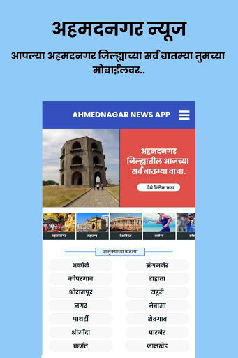 There are 14 talukas (regions) in Ahmednagar district. Akole, Jamkhed, Karjat, Kopargaon, Nagar, Nevasa, Parner, Pathardi, Rahata, Rahuri, Sangamner, Shevgaon, Shrigonda, Shrirampur This Express & Fast single app to get all of news around the above listed talukas.