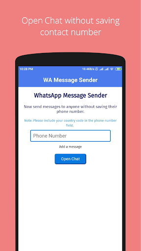Open Chat of anyone just by entering their phone number. You don't need to save their contact number anymore. Also you can add text messages and send to them without saving their contact number.