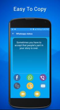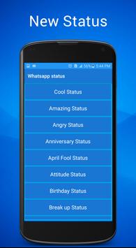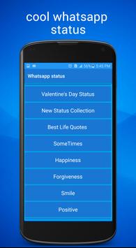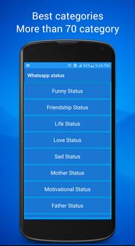like love status for whatsapp and if you search about cool whatsapp status or funny you can find it in this app and whatsapp quotes and latest whatsapp status and you can find short status for whatsapp and best whatsapp status messages