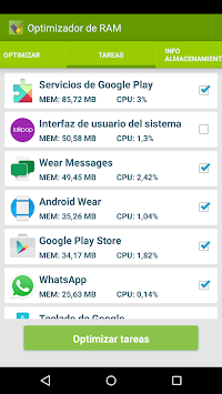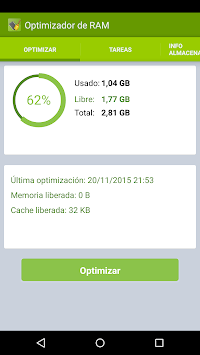 With this application of minimum size, you can optimize the RAM of your Android in a very simple way. - Optimize RAM - Clean the cache - Stop consuming tasks RAM - Watch your android storage