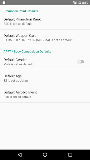A settings page allows you to set your promotion rank, weapon card, gender, age, and aerobic event so you don't have to adjust them every time you use the app.