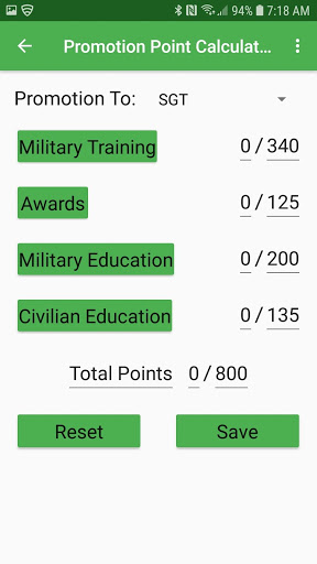 The Promotion Point Calculator calculates the promotion points for promotion to SGT (E-5) and SSG (E-6).