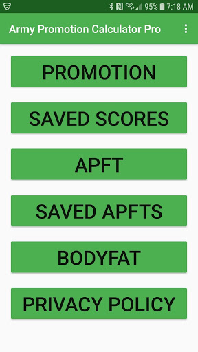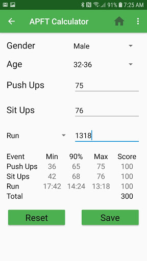 Additional APFT Calculator calculates your PT Score based off your push ups, sit ups, and 2-mile run time.