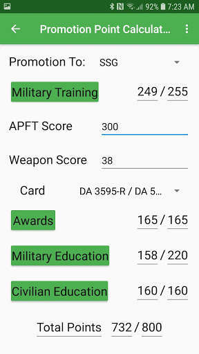 Input Military Training, Awards and Badges, Military Education, and Civilian Education to determine points awarded for promotion to SGT/SSG based on the 800 point scale in accordance with AR 600-8-19 (Enlisted Promotions and Reductions).