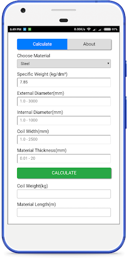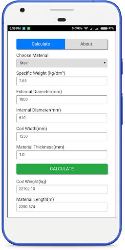 The Coil Calculator app is designed to help you quickly and easily determine flat rolled coil sizes based on your specific requirements. The Calculator can be used to estimate coil Weight and Strip Length by using Outside Diameter, Inside Diameter, Width and Thickness of Strip.