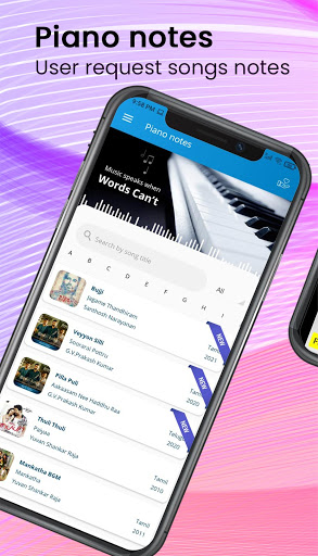 Get Latest Piano Songs Notes on your finger tips. We are including songs based on users requests. So, Don't panic if you don't find your favorite songs. Reach out to us on a single tap and request any song.