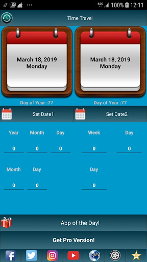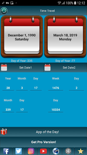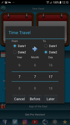 Time Travel is an excellent date calculator for personal and professional use. Calculate the number of days, weeks, months, years between two dates. Go to a number of days, months and years ago or later from a date. Learn your age in year/month/day format, as well as the number of days, weeks, months, years from your birthday.