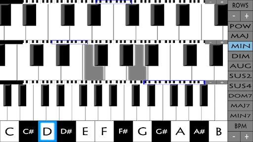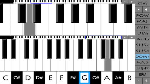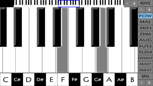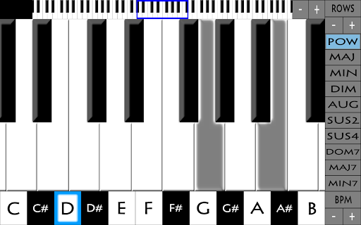 You can play chords in the background to accompany your notes. On the bottom you can set the chord's pitch, and to the right you can choose from 10 available chord variations: power, major, minor, diminished, augmented, suspended 2nd, suspended 4th, dominant 7th , major 7th, and minor 7th.