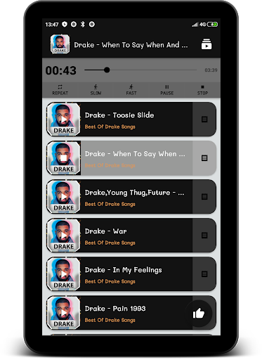 Drake Songs (Lyrics) Application contain the best 10 Drake Music Offline plus Lyrics,and comes with lyrics in each song, and this application can run Offline without need for internet.