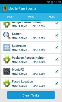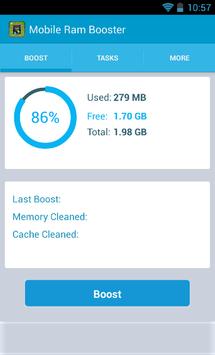 Mobile Ram Booster is really a free, effective utility which could can make your Android Device faster. This application boost the performance by cleaning the free memory or RAM. Touch boost button and obvious running process. In Tasks tab you are able to swipe to clean individual process from random access memory. In additional tab additionally you learn about your internal and exterior memory status.